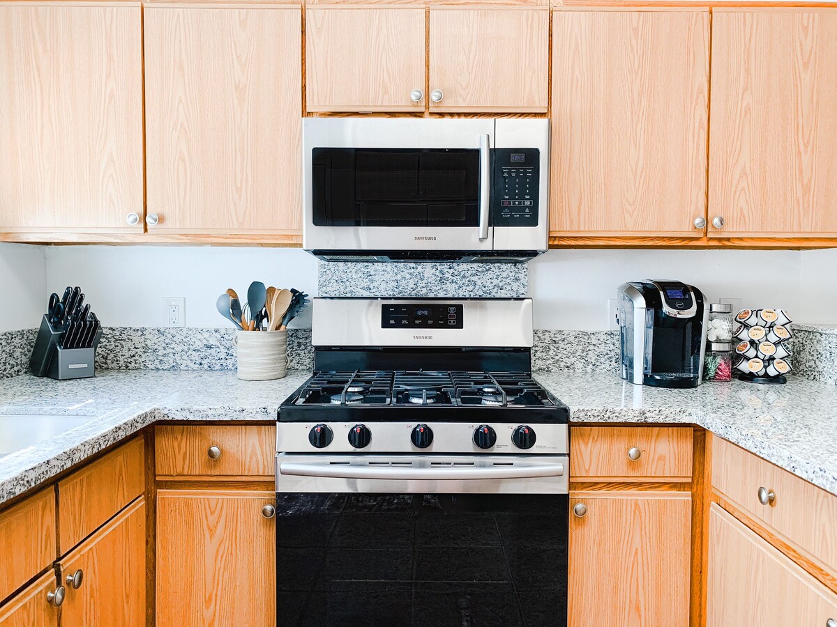 – Keurig coffee maker with a selection of K-cup pods, sugar and coffee creamer. Drip coffee maker and French press also available for guest use.