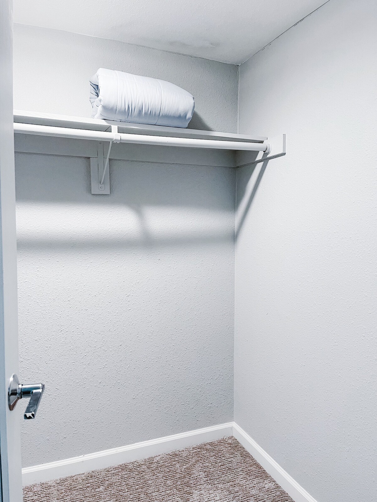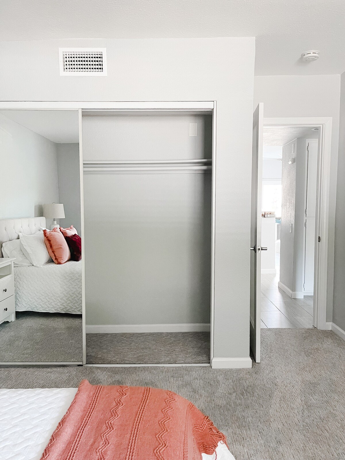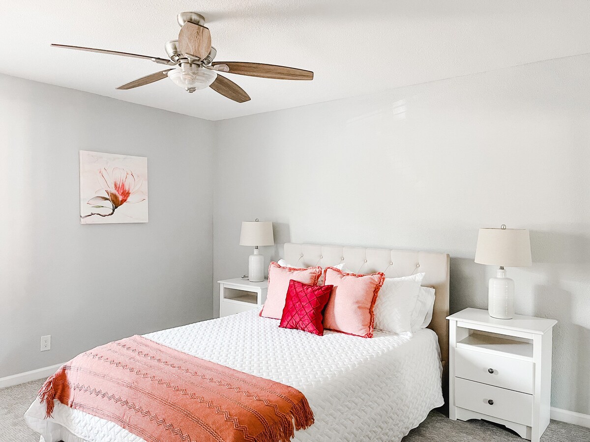 – Bedroom 2 has a queen sized bed and closet with hangers.