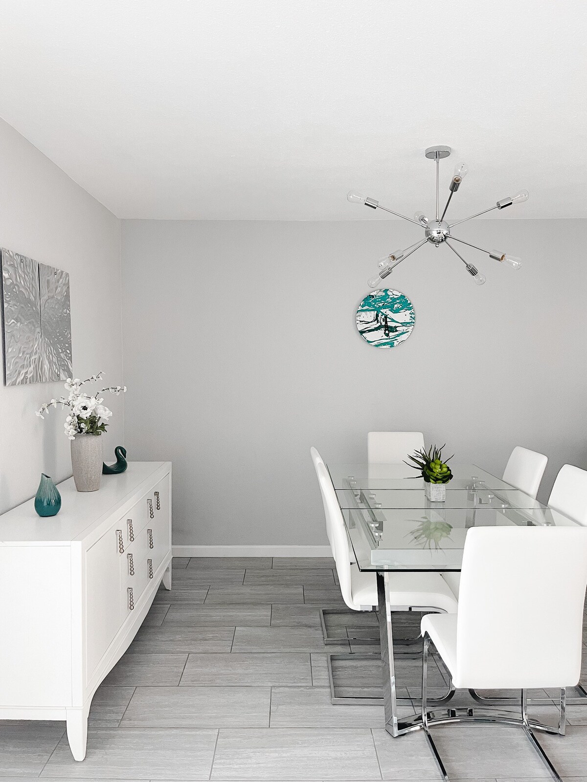 – Dining table with seating for six (additional barstool seating in the kitchen)