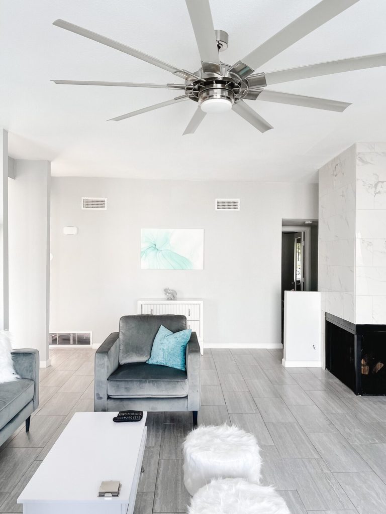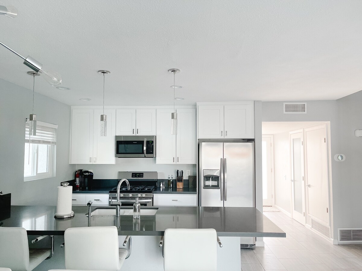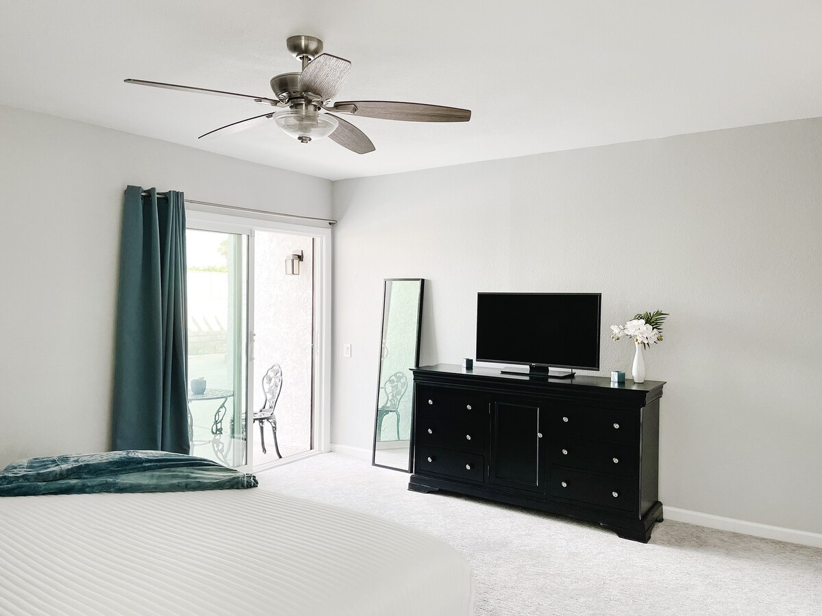 – Open concept living/dining/kitchen with high ceilings and sliding doors/windows along the east wall overlooking the pool.