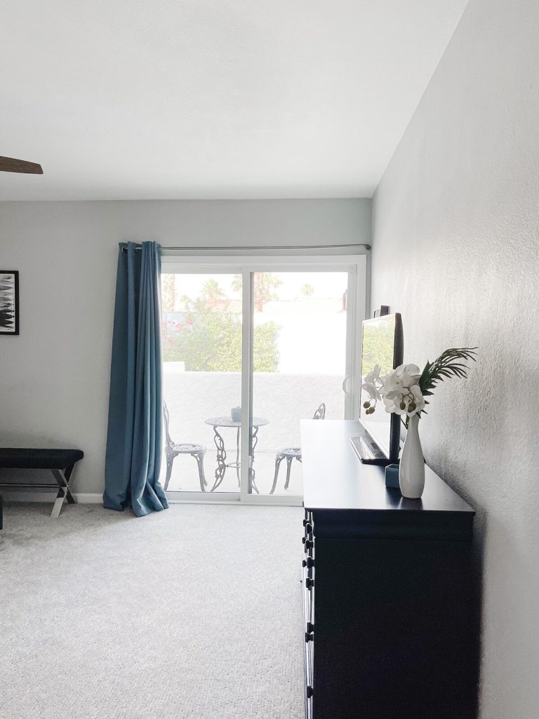 – Sliding doors lead out to the back patio with a bistro table and chairs