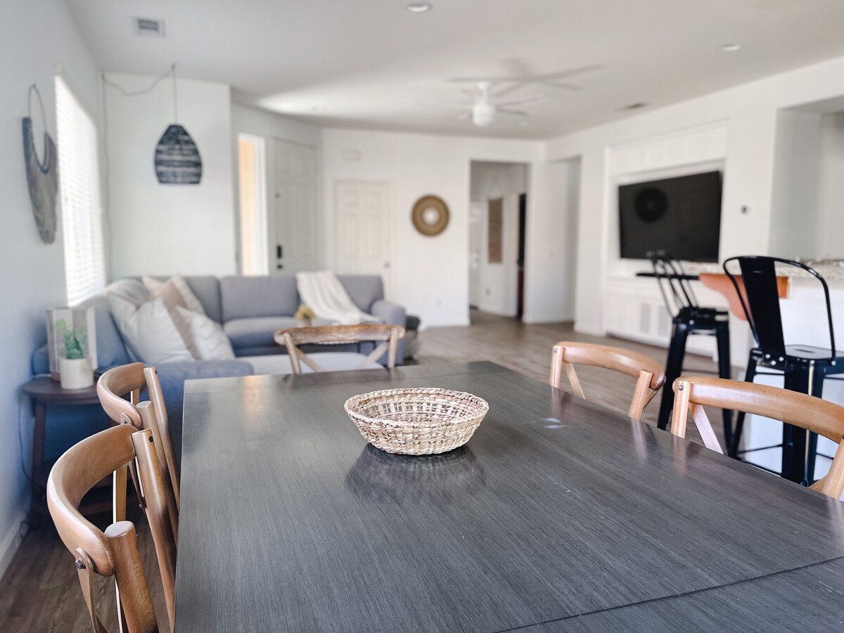 – Dining table with seating for six (plus additional barstool seating at the kitchen island)