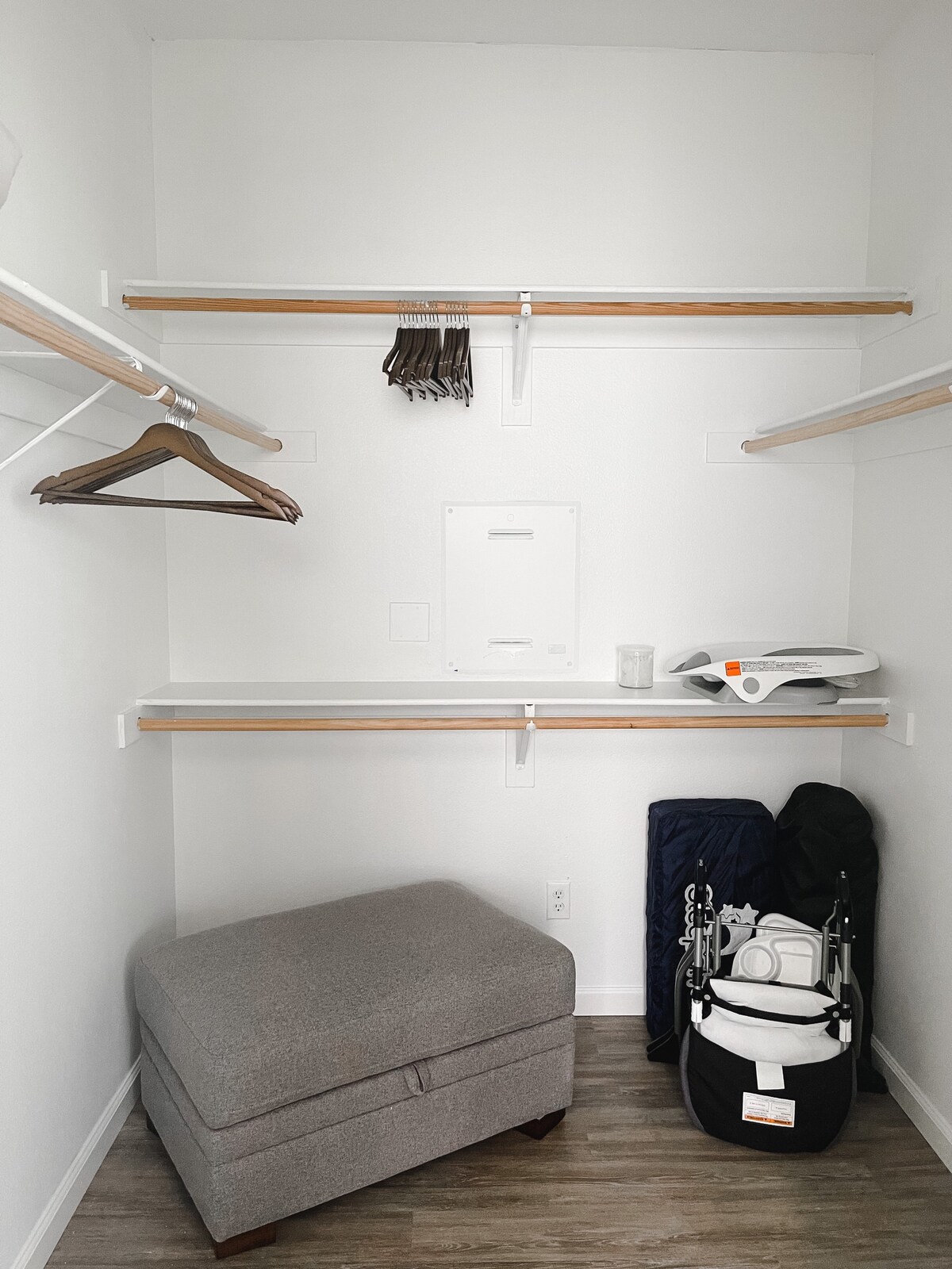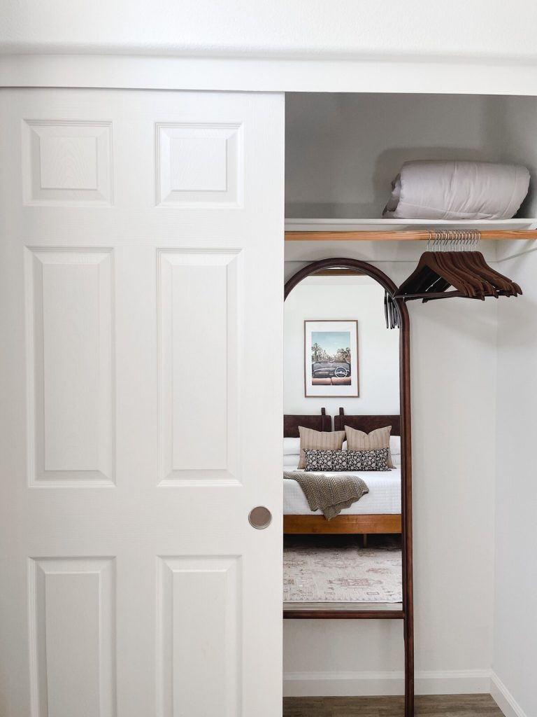 – Bedroom 3 has a queen sized bed and a closet with hangers.