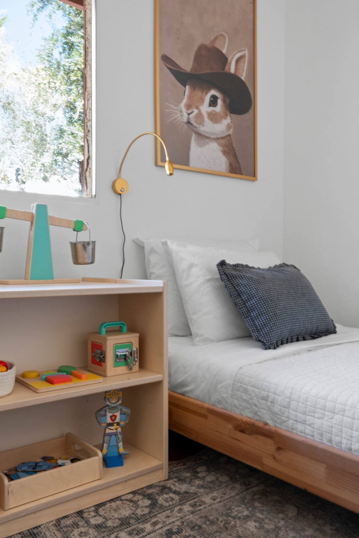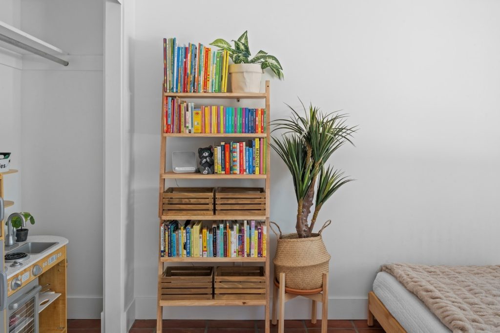 Kids’ bedroom with twin beds, books, toys, and play kitchen