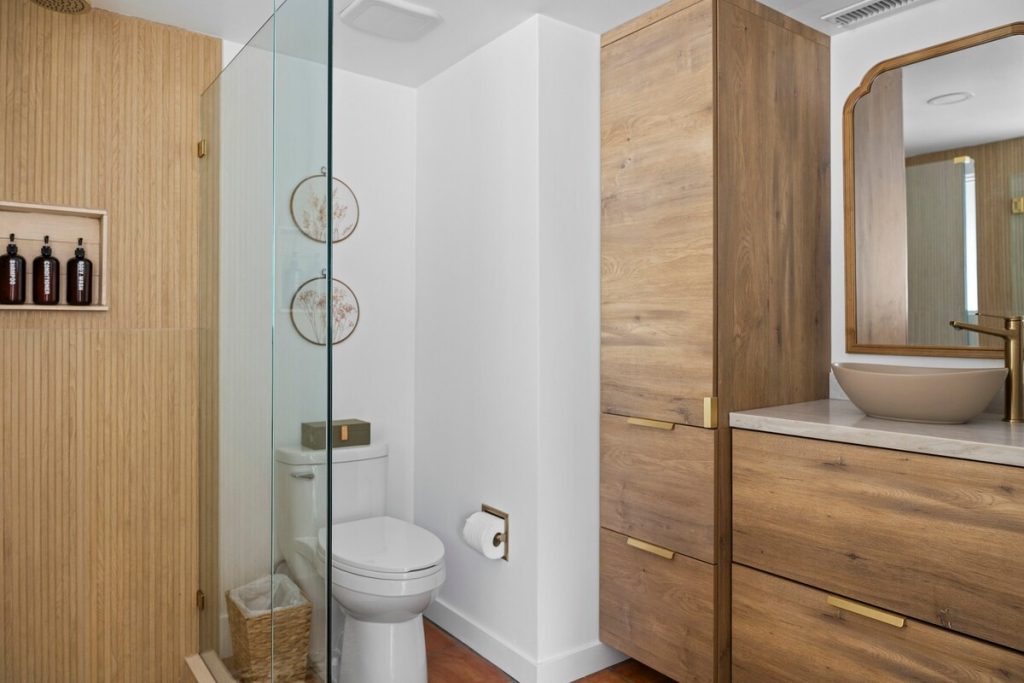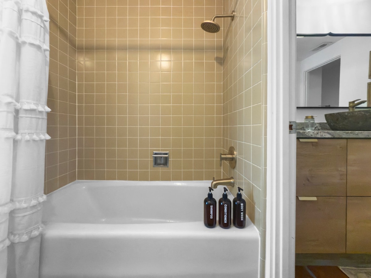 Each stocked with towels, shampoo, conditioner, body wash, toilet paper, hand soap, and hair dryer