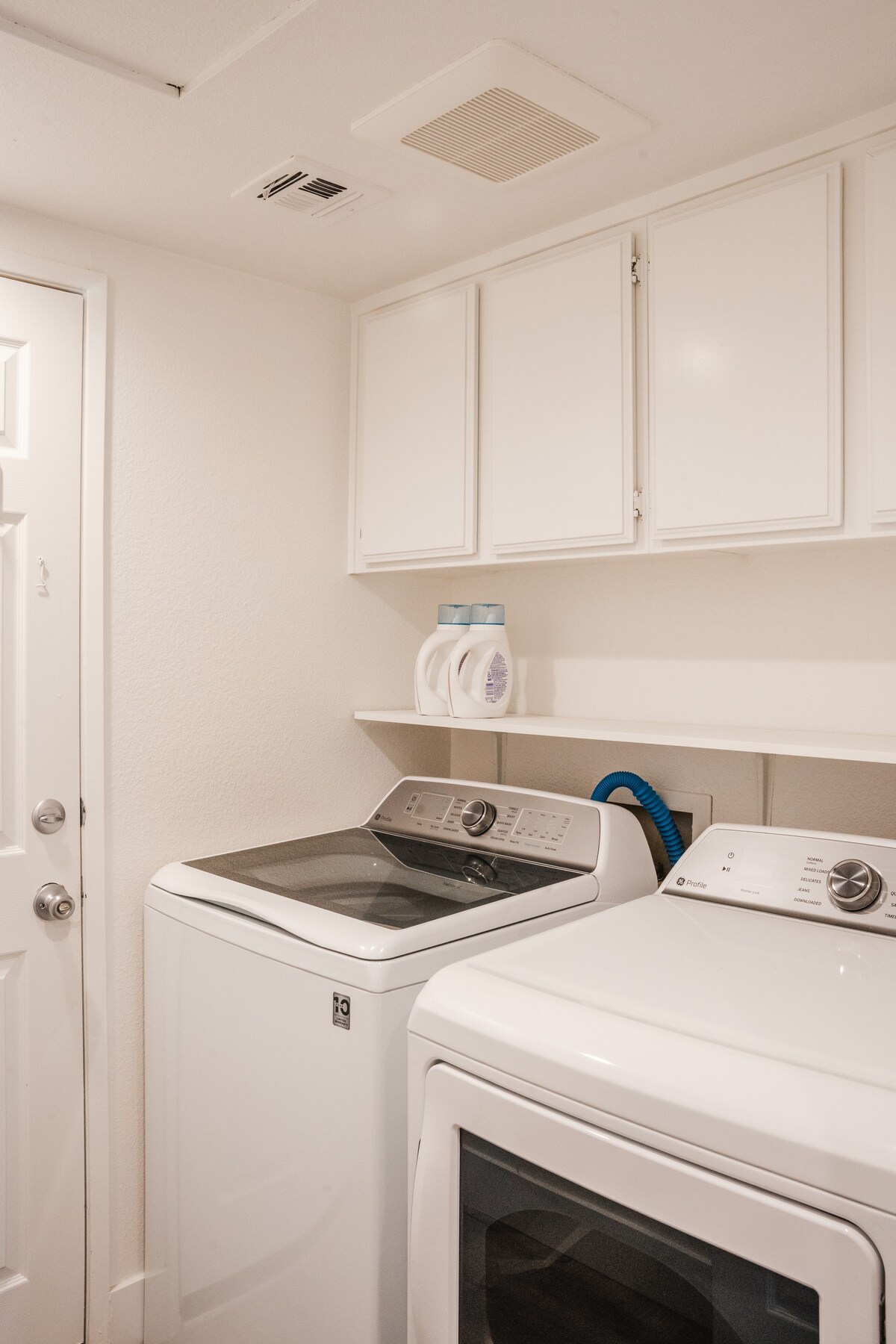 – Full-size washing machine and dryer with complimentary-use laundry detergent and fabric softener