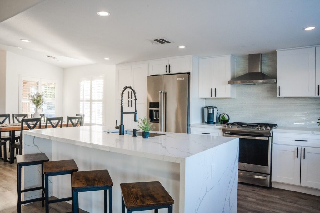 – Dining table with seating for eight, barstool seating also available in kitchen
