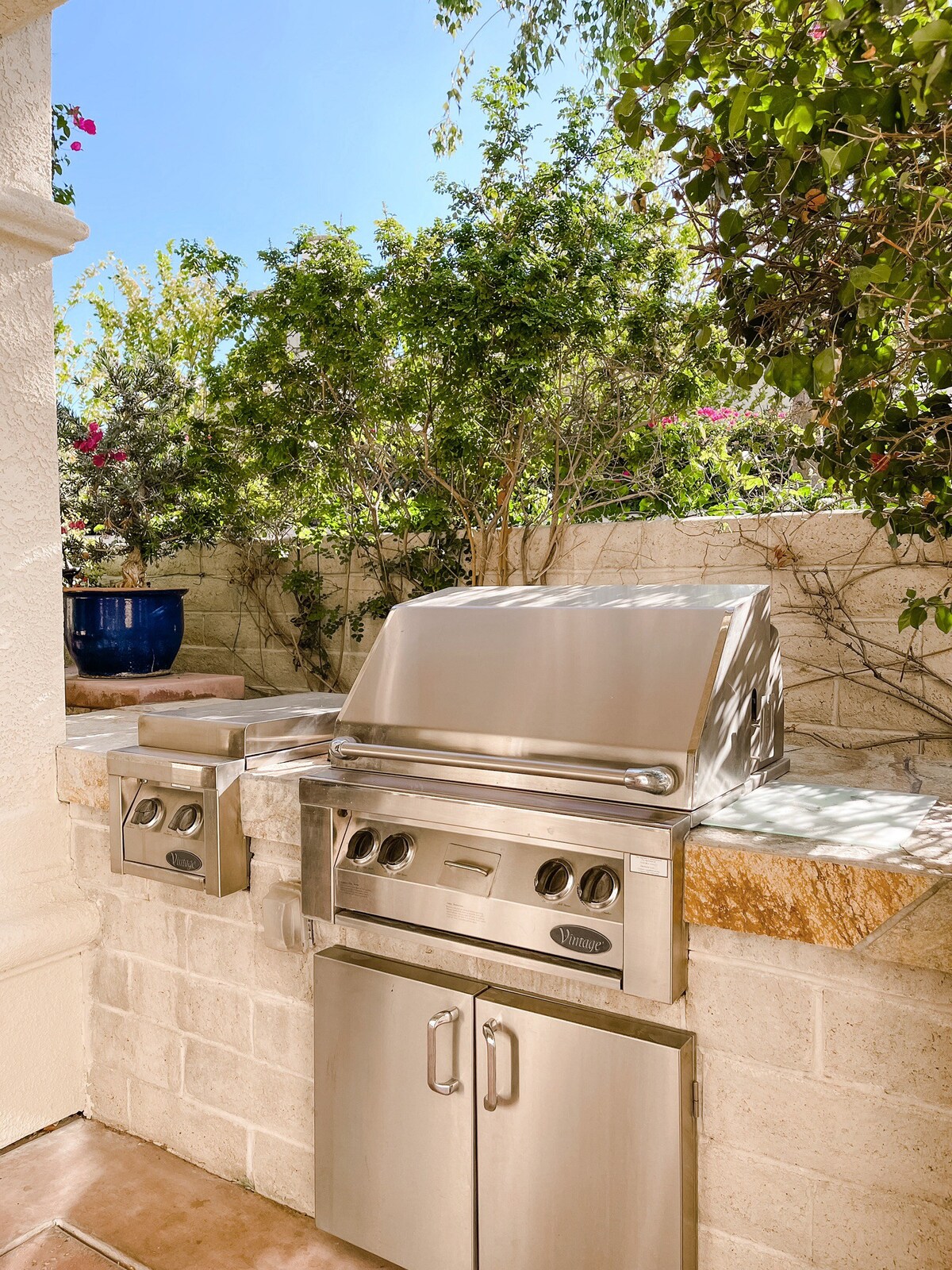 – Built-in BBQ and grilling utensils (BBQ is permanently fixed to a gas line so no propane tanks are required)