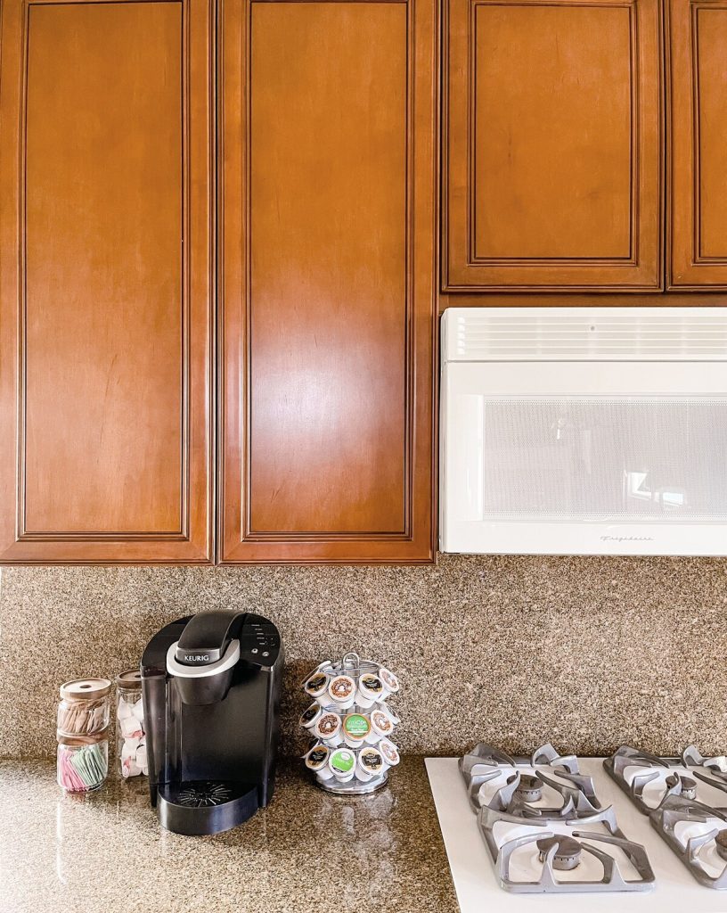 – Keurig coffee maker with complimentary K-cup pods, sugar and coffee creamer. Drip coffee maker also available.