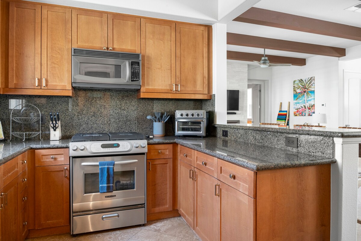– Refrigerator, gas stove, oven, microwave, toaster oven and dishwasher
